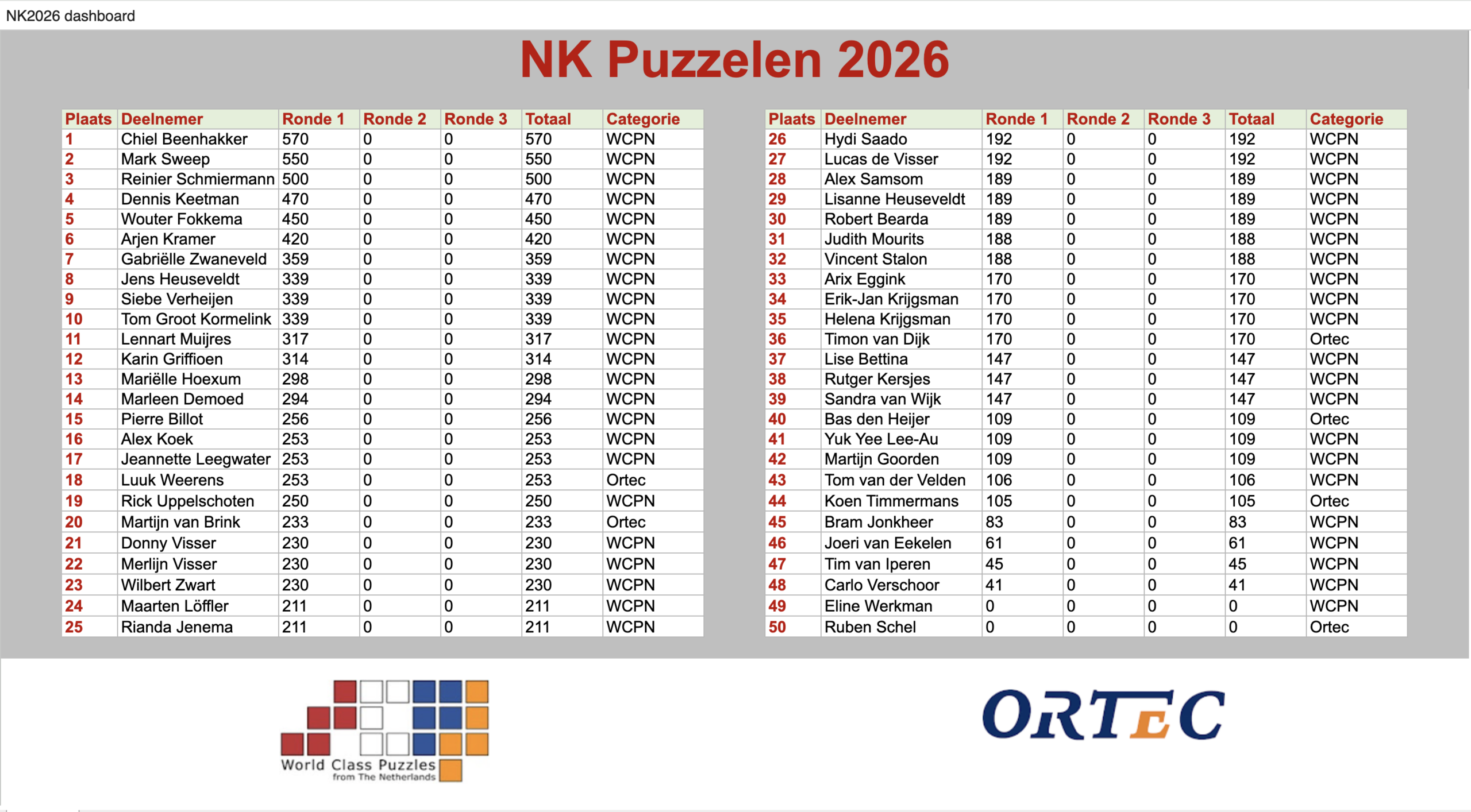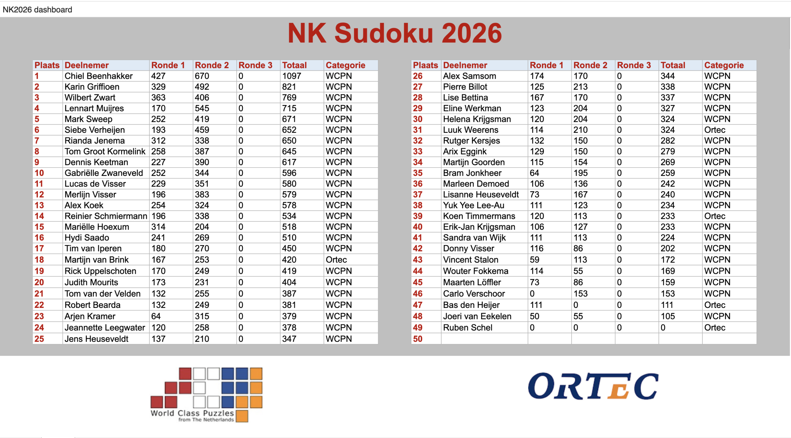 De uitslagen tot nu toe (2 rondes sudoku, en 1 ronde puzzelen):